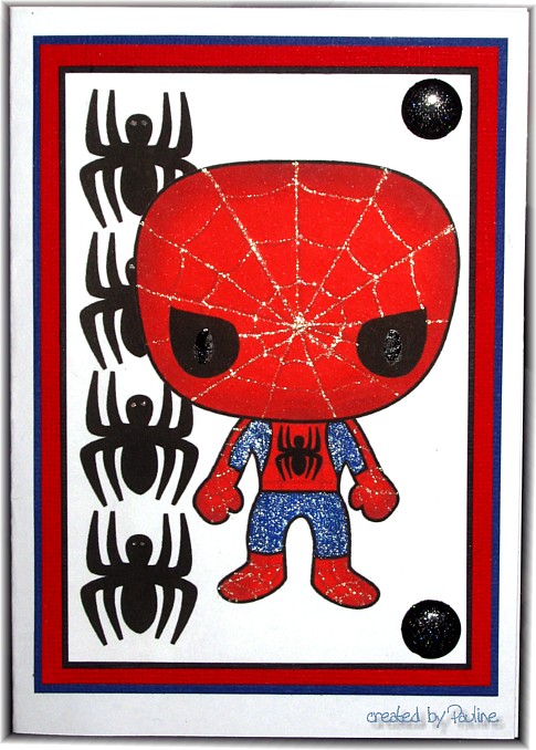 I layered spiderman over a created spider border, printed and coloured him. I traced his web with clear stardust for sparkle. Adding some big brads to balance the spiders, I then matted the image, and added the layers to a white cardbase...